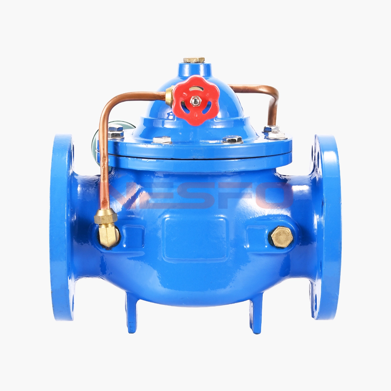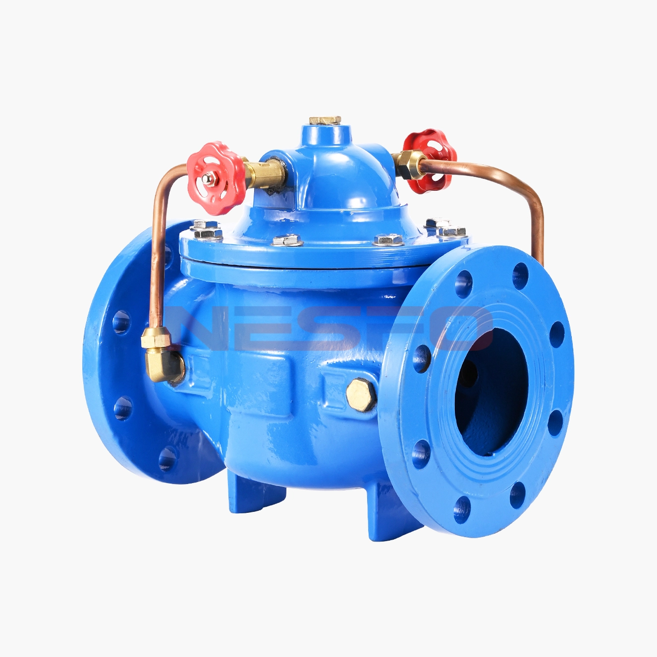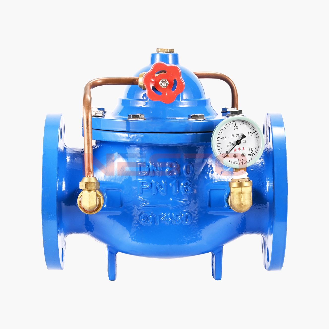 300X缓闭式止回阀由主阀、单向阀、针型阀、球阀、微形过滤器和压力表组成水力控制接管系统。利用水力自动操作,可使主阀得到迅速的开启或缓慢的关闭速度。防止水锺水击的产生,以达到缓闭消声的效果。当缓闭止回阀从进口端给水时,水通过微形过滤器、针型阀、单向阀进入主阀控制室,再经过球阀排水至下游。因为针型阀开度小于球阀开度,即主阀控制室的排水速度大于进水速度,因此控制室压力降低,作用于主阀盘下端的进口压力打开主阀向下游供水。当管道停止供水时,若下游水开始回流,一部分回流水经球阀进入主控制室,由于单向阀作用,回流水不能从主控制室流出,引起主控制室逐渐升压,缓缓关闭主阀。